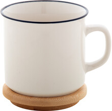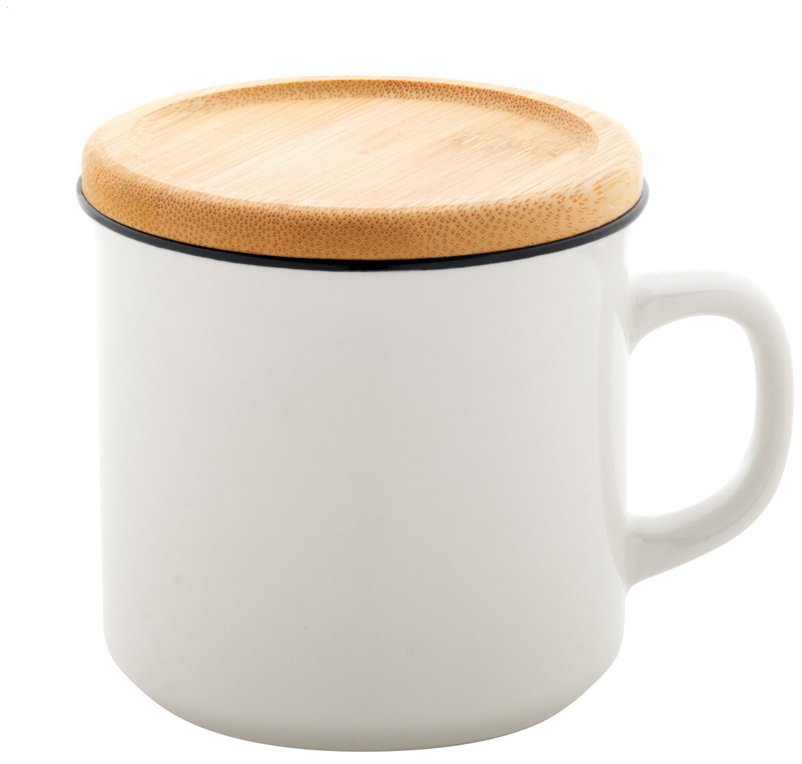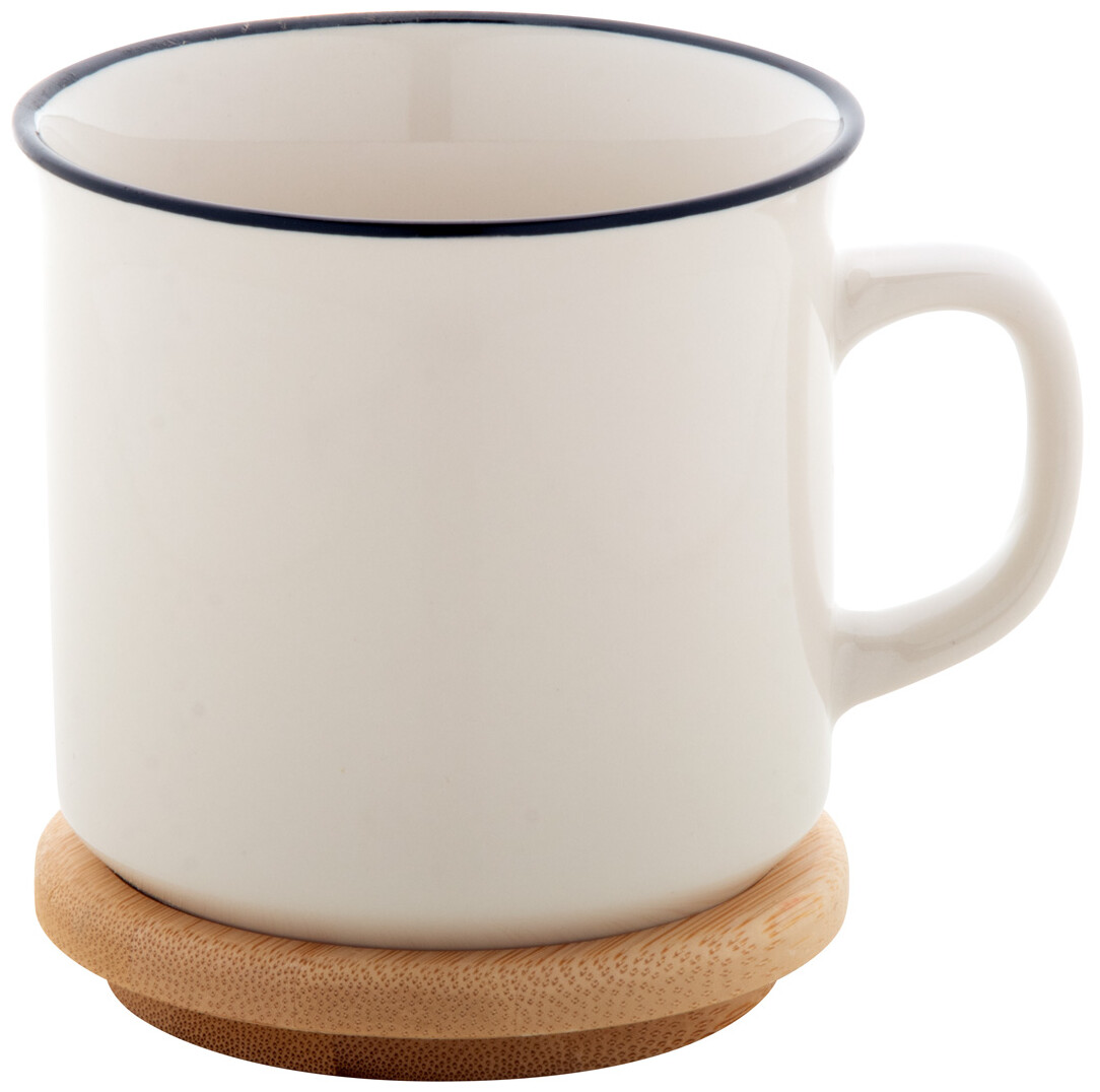 Vysoce kvalitní porcelánový retro hrnek v bílé barvě s černým okrajem a bambusovým podtáckem, 320 ml. V dárkové krabičce.