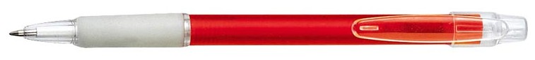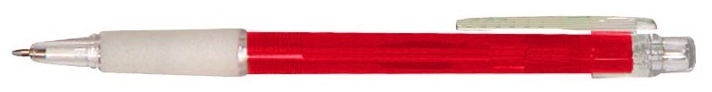 Kuličkové transparentní pero PROSTO. Má gumový úchop, tělo pera je červené. Klip a špička pera je průhledná.Náplň je X20, modře píšící.