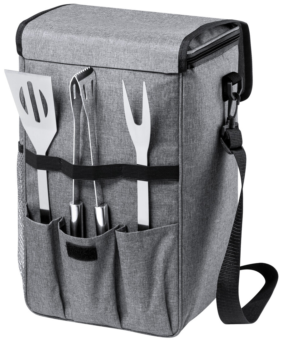 Chladicí taška RPET s PEVA výstelkou, přihrádkou na zip a nastavitelným ramenním popruhem. Včetně 3 ks nerezové sady na grilování (vidlička, lopatka a kleště). 600D RPET polyester s výrazným štítkem RPET.