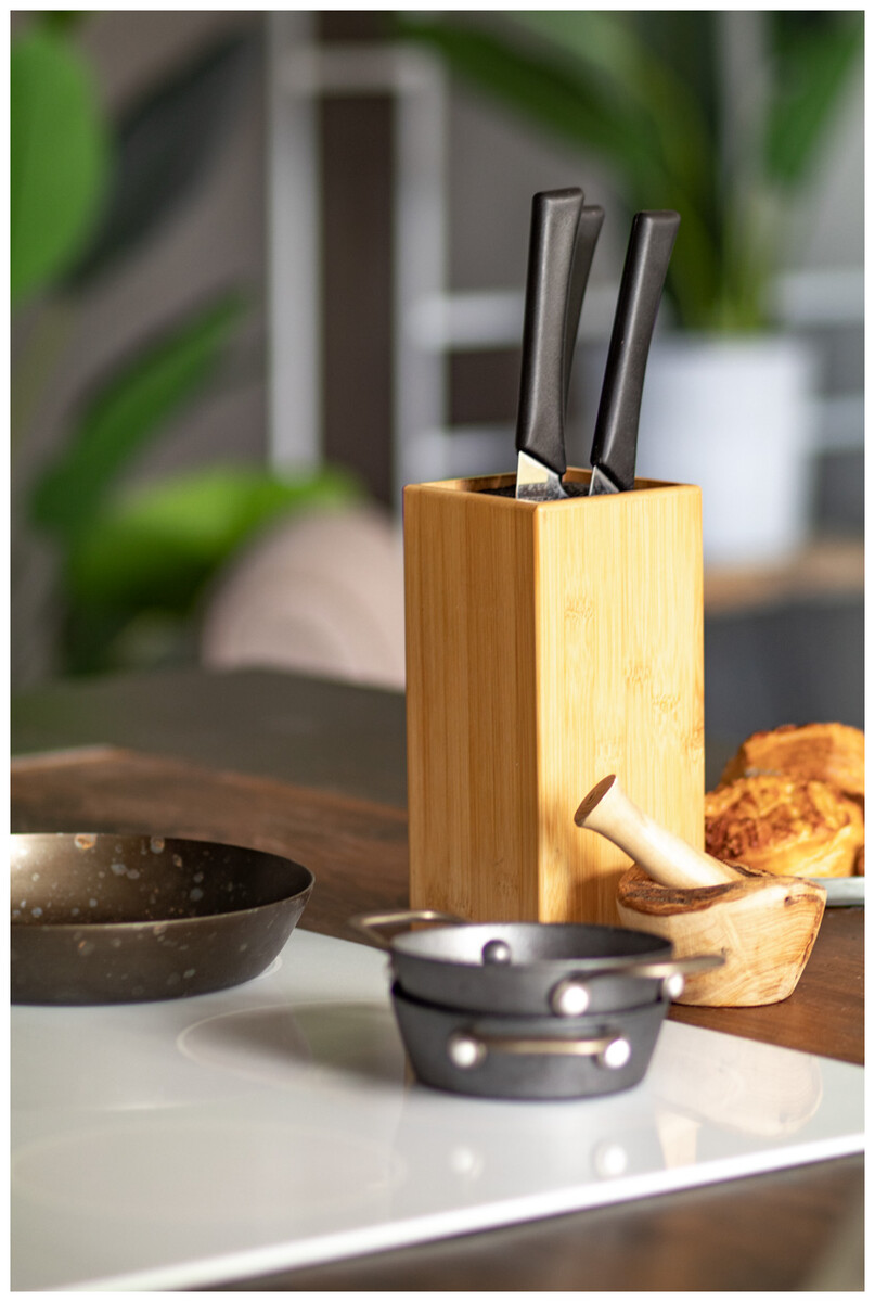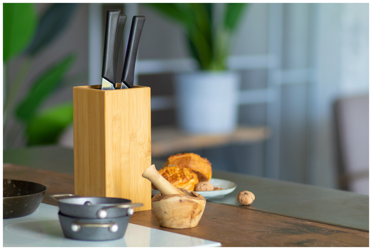 Univerzální bambusový držák na nože s plastovými štětinami.