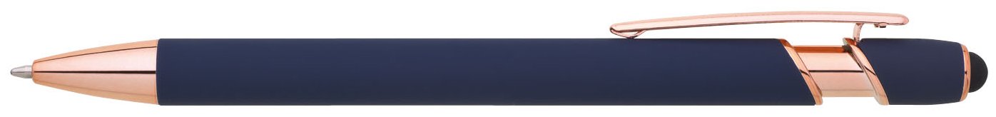 Kovová propiska se soft povrchem, touch koncovkou a doplňky v růžovo-zlaté barvě. Laserované logo je lesklé, růžovo-zlaté. Náplň modře píšící.