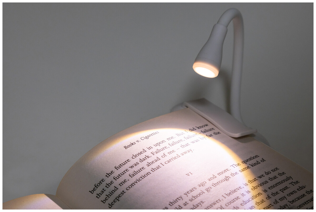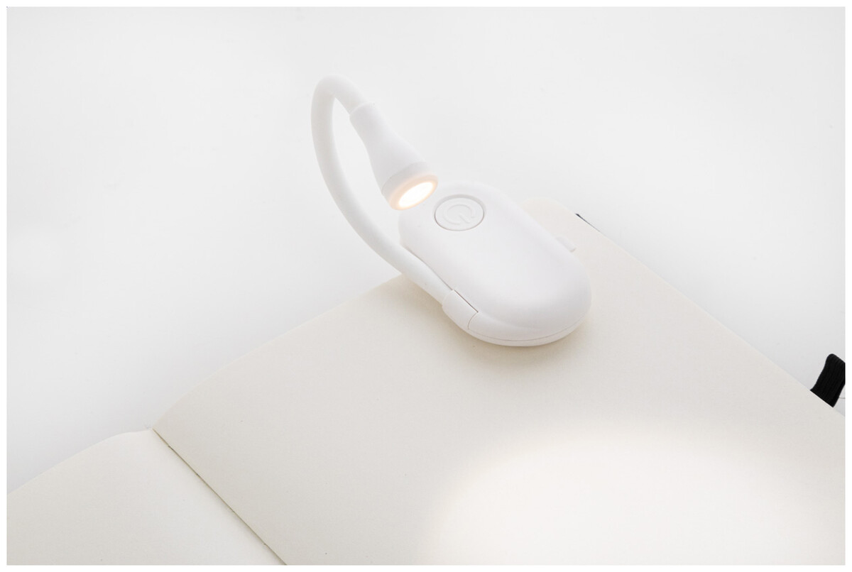 Klipová lampička na čtení z ABS s flexibilní LED lampou a vestavěnou USB dobíjecí baterií (220 mAh). S režimy teplého, přirozeného a studeného světla. Včetně USB nabíjecího kabelu.