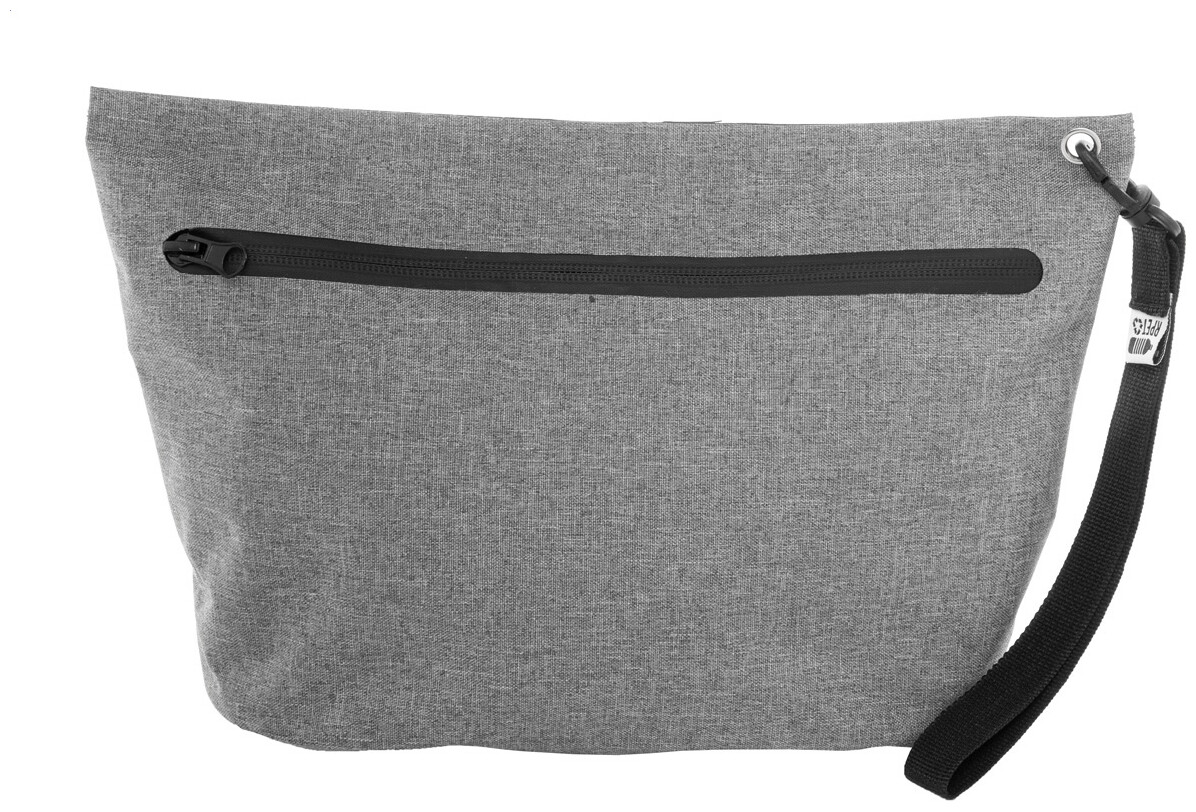 Vodotěsná kosmetická taštička na zip z 300D RPET polyesteru s karabinou na zápěstí. S výrazným štítkem RPET.