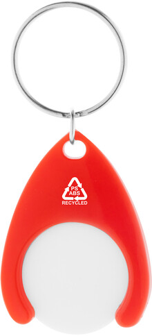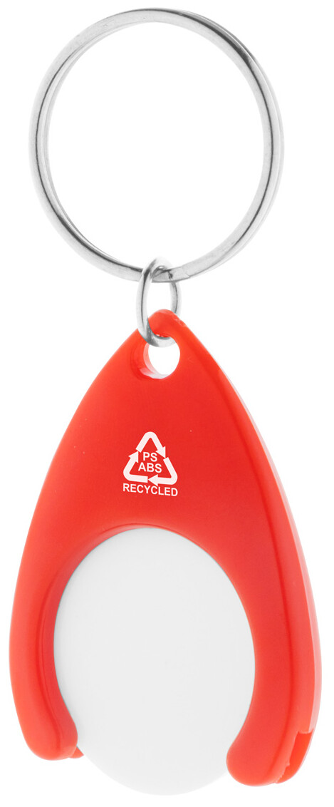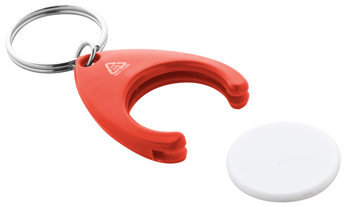 Přívěšek na klíče z recyklovaného ABS a recyklovaného plastu PS se žetonem do nákupního vozíku a kovovým kroužkem. Velikost mince: ø24×2 mm.
