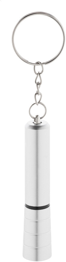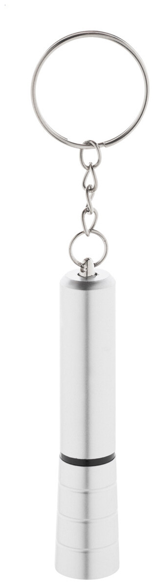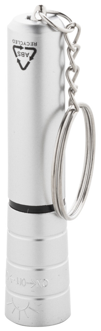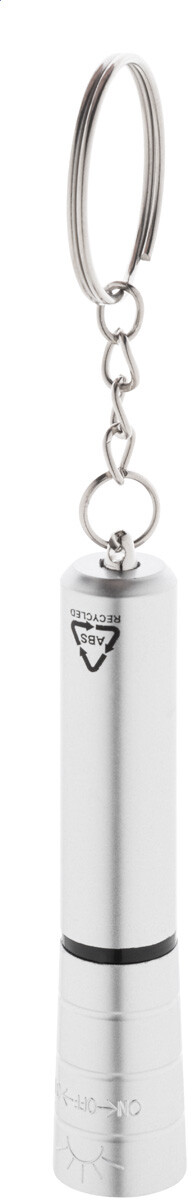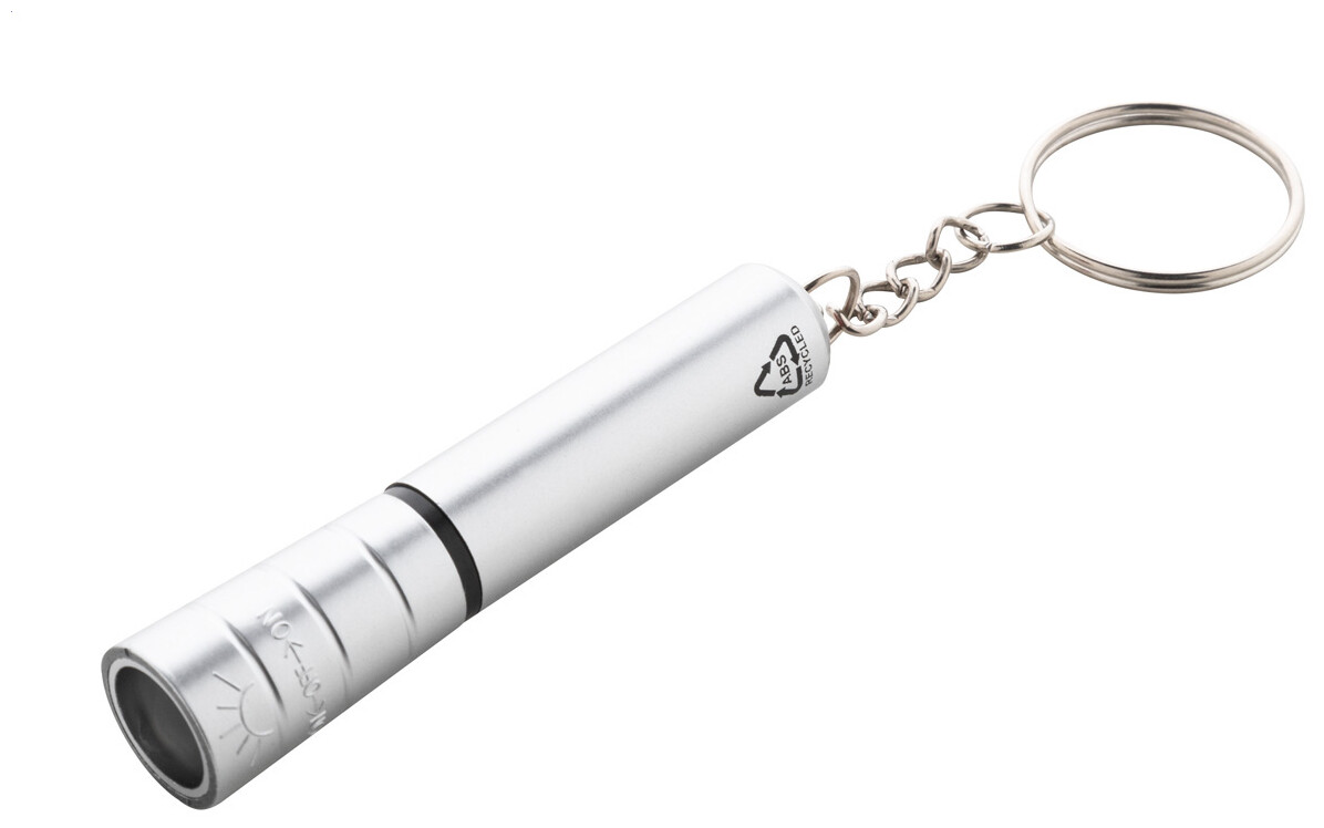 Mini baterka s 1 LED, z recyklovaného ABS plastu s kovovým povrchem a kovovým kroužkem na klíče. S knoflíkovou baterií.