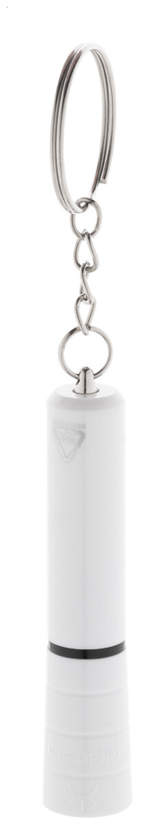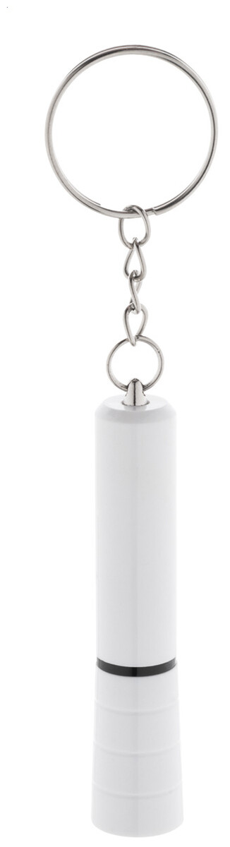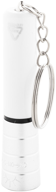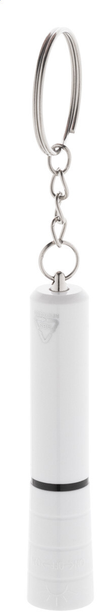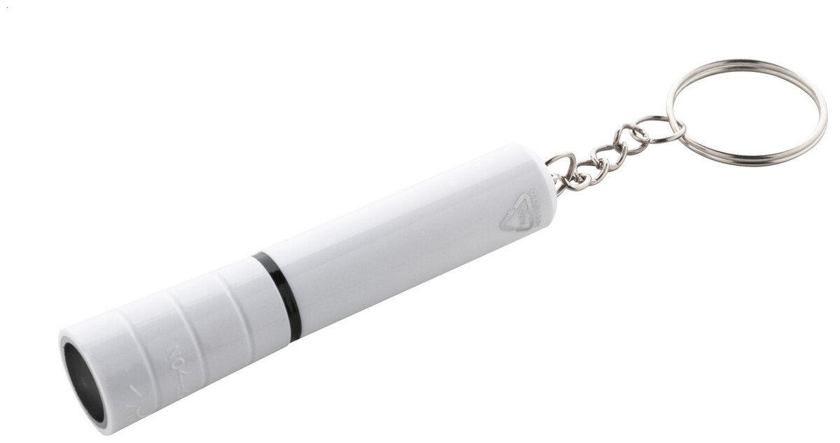 Mini baterka s 1 LED, z recyklovaného ABS plastu s kovovým povrchem a kovovým kroužkem na klíče. S knoflíkovou baterií.