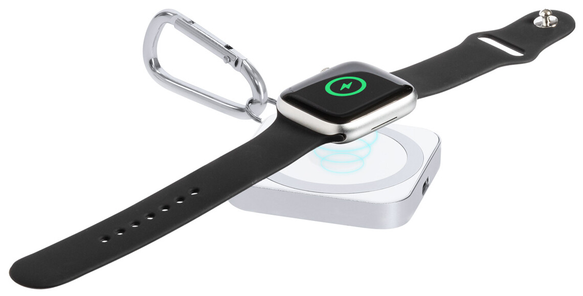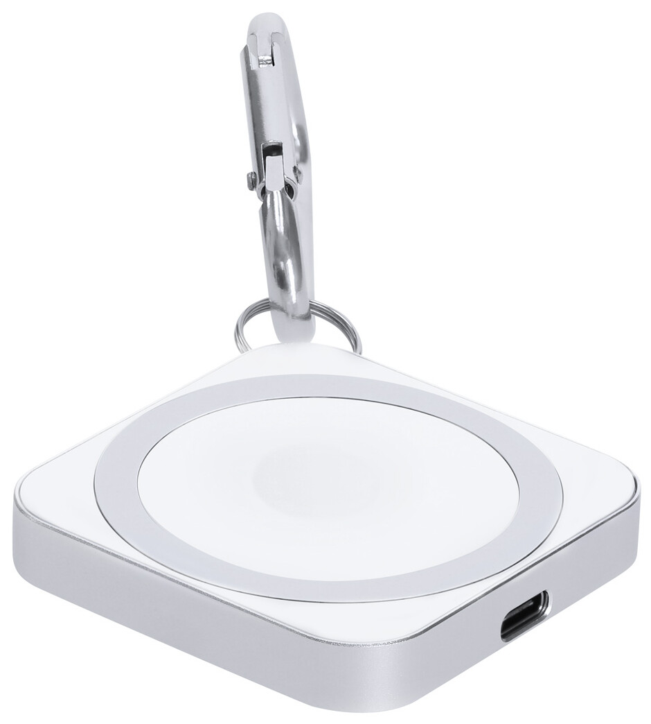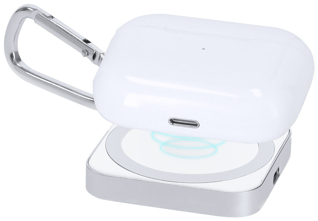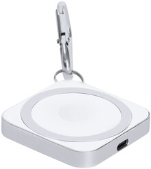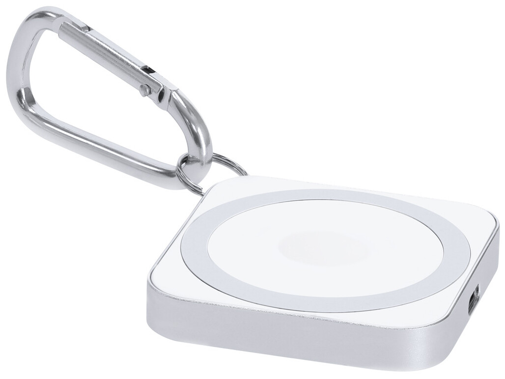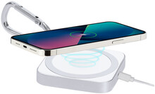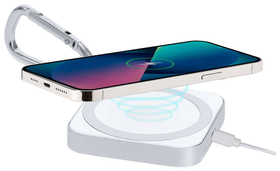 Magnetická bezdrátová rychlonabíječka (15W) v hliníkovém pouzdře s karabinou. Určeno pro nabíjení smartphonů, sluchátek a chytrých hodinek. Kompatibilní s iPhone® 12 nebo novějším.