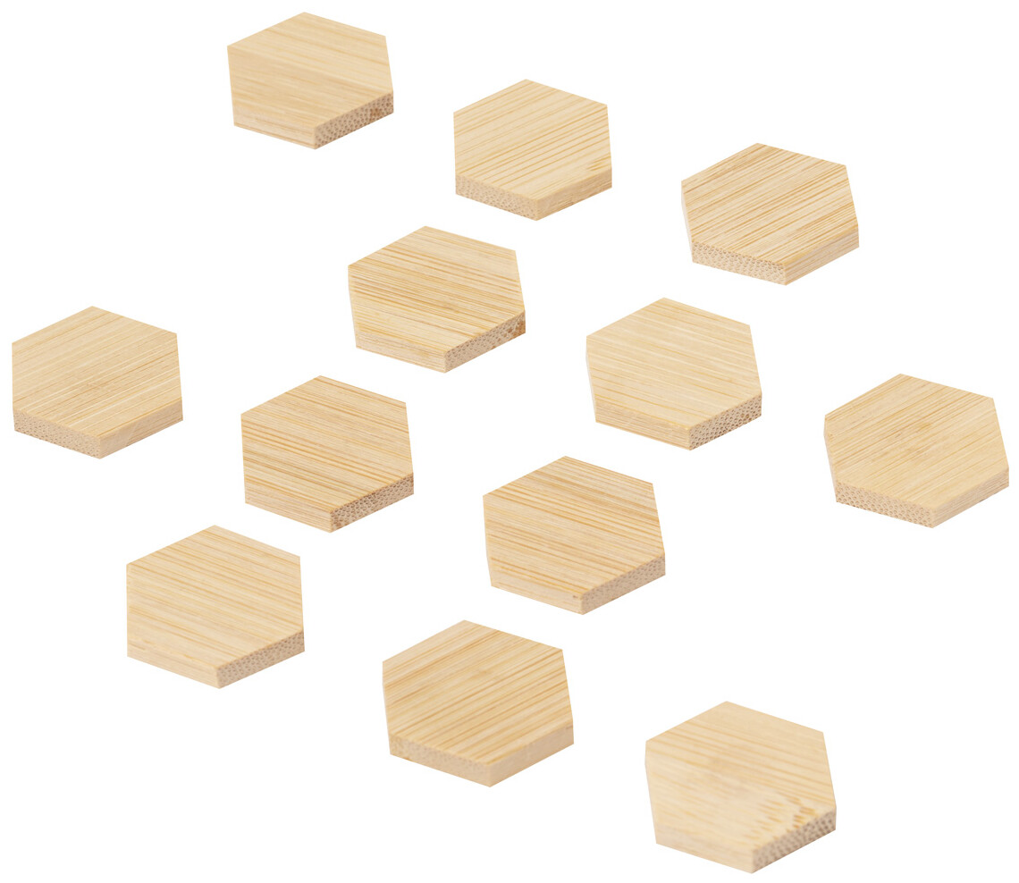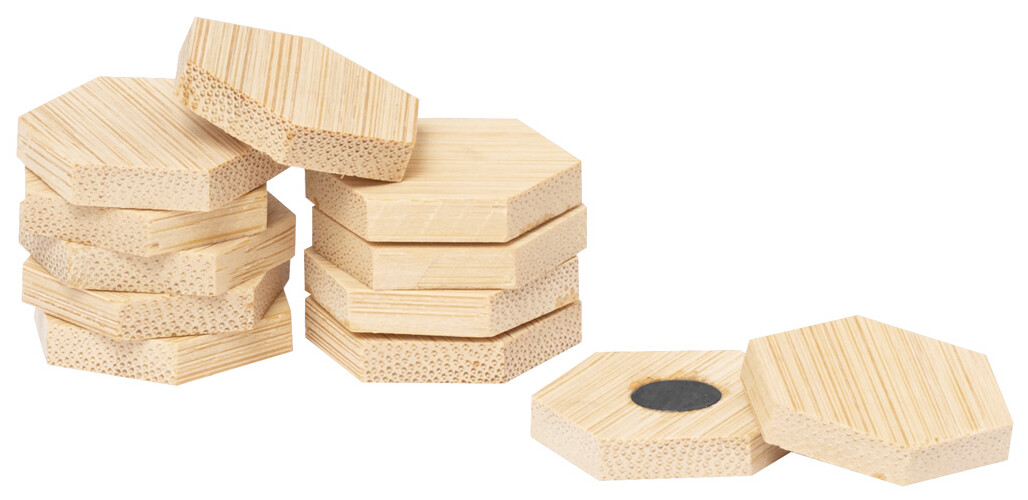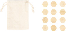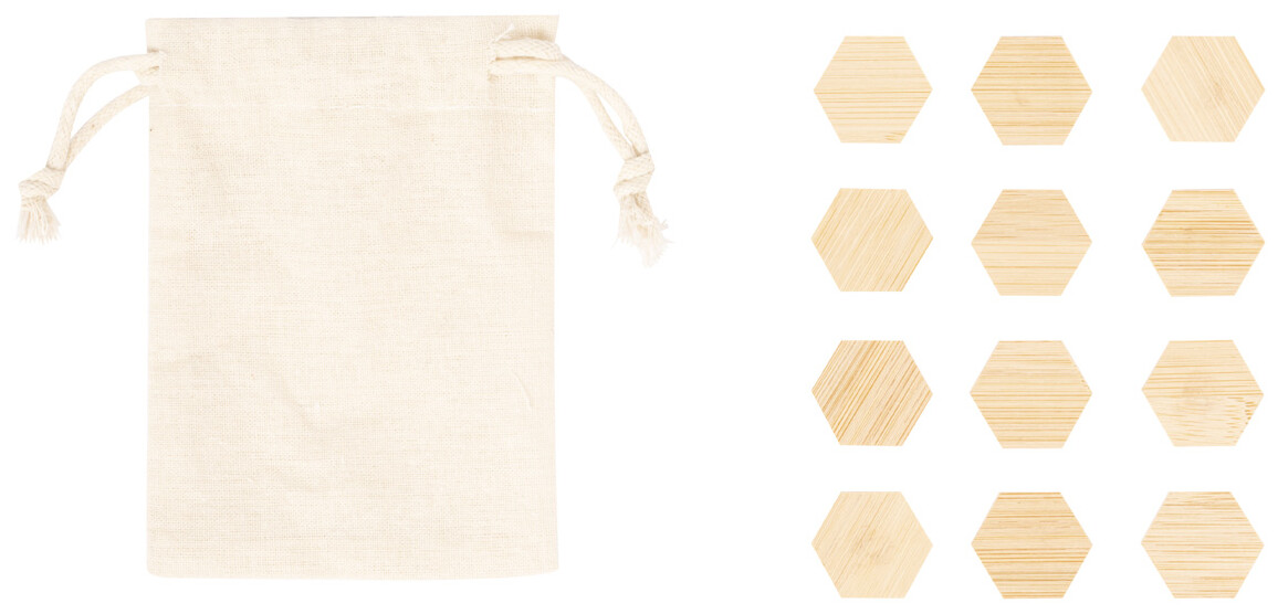 12dílná sada bambusových magnetů na ledničku, v bavlněném pytlíku se stahovací šňůrkou.