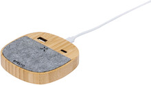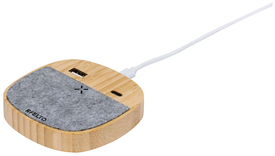 Bezdrátová rychlonabíječka (15W) v pouzdru z bambusu a RPET plsti. S 1 USB a 1 USB-C nabíjecím portem pro současné kabelové a bezdrátové nabíjení. Včetně USB nabíjecího kabelu.