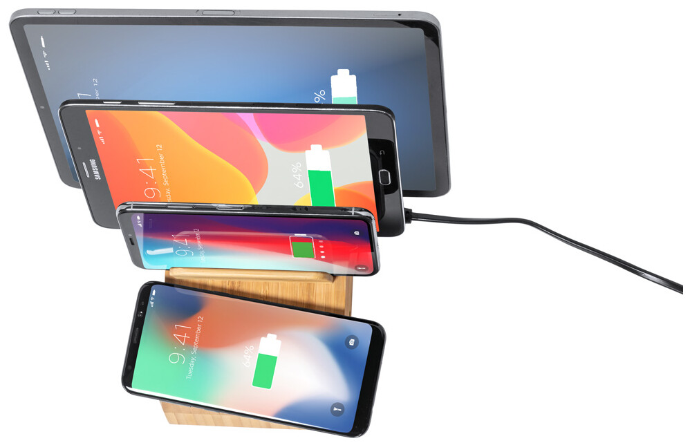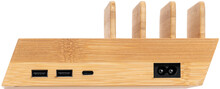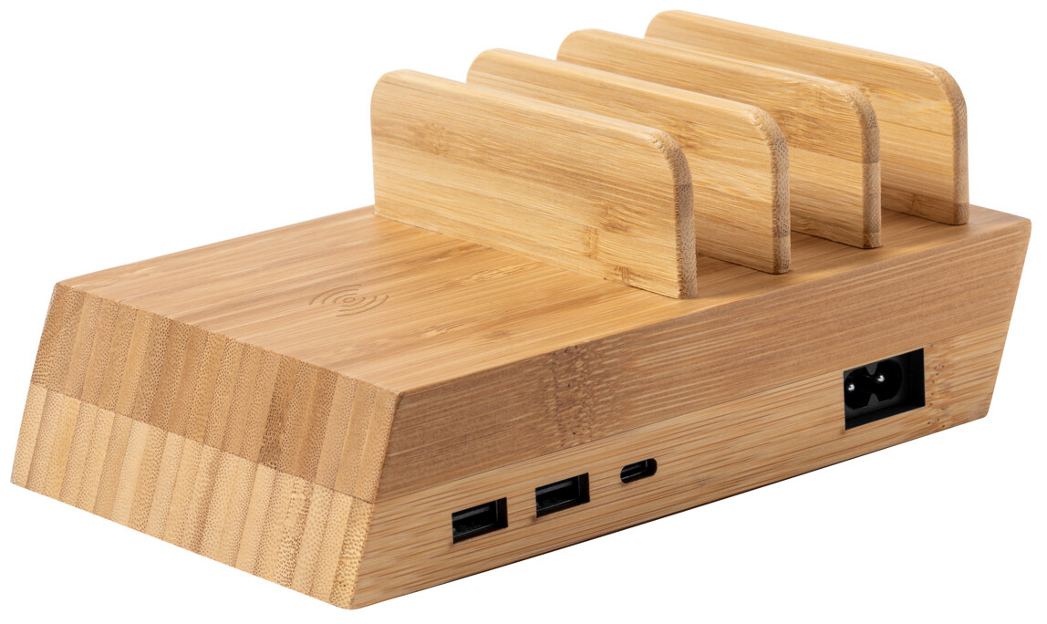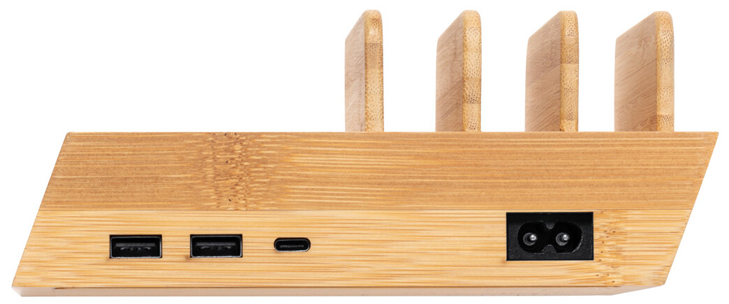 Bambusová USB nabíjecí stanice s držáky na mobil a vestavěnou bezdrátovou rychlonabíječkou. Se 2 porty USB a 1 portem USB-C pro nabíječku. Včetně AC nabíjecího kabelu.