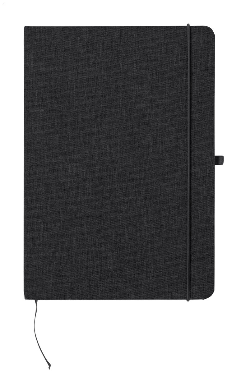 Blok A5 potažený polyesterem 300D RPET s 80 čistými listy. S gumovým páskem, záložkou a držákem na pero.