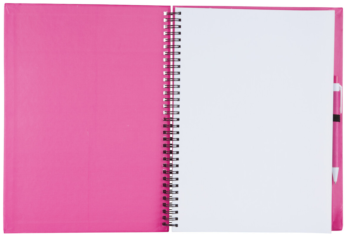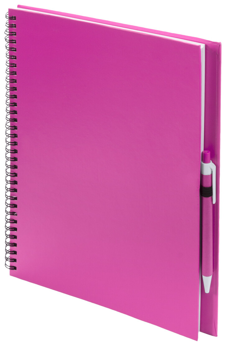 Poznámkový blok A4 s 80 čistými listy a spirálovou vazbou v kartonových deskách, vč. stejně barevného kuličkového pera z recyklovaného papíru s modrou náplní.