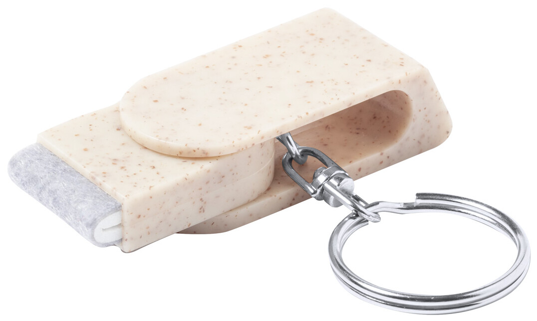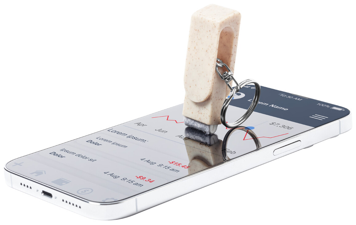 Ekologický plastový držák na mobil z pšeničné slámy s čističem obrazovek a kovovým kroužkem na klíče.