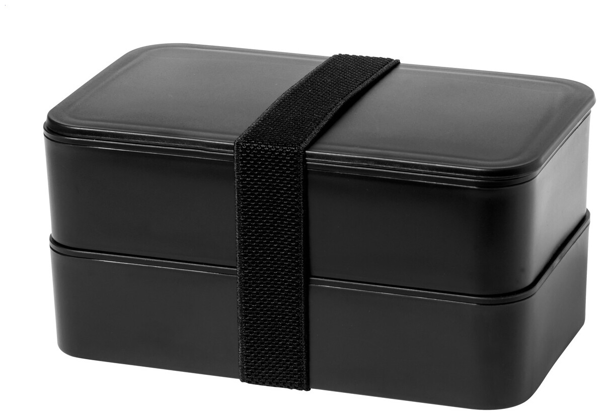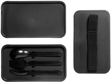 Box na jídlo z PP plastu se sadou příborů (vidlička, lžíce a nůž) a elastickým páskem. Se 2 přihrádkami o objemu 700 ml.