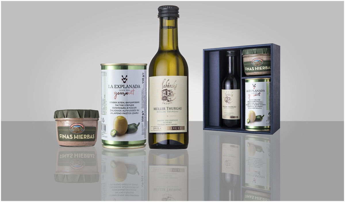 víno jakostní Muller Thurgau 0,187 l, zelené olivy La Explanada Gourmet plněné jalapeňos