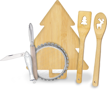 Zavírací nůž "Rybička", Kuchyňská škrabka, Kráječ na brambory a zeleninu, Krájecí prkénko z bambusu ve tvaru stromečku, Vánoční naběračky na salát z bambusu 2 ks