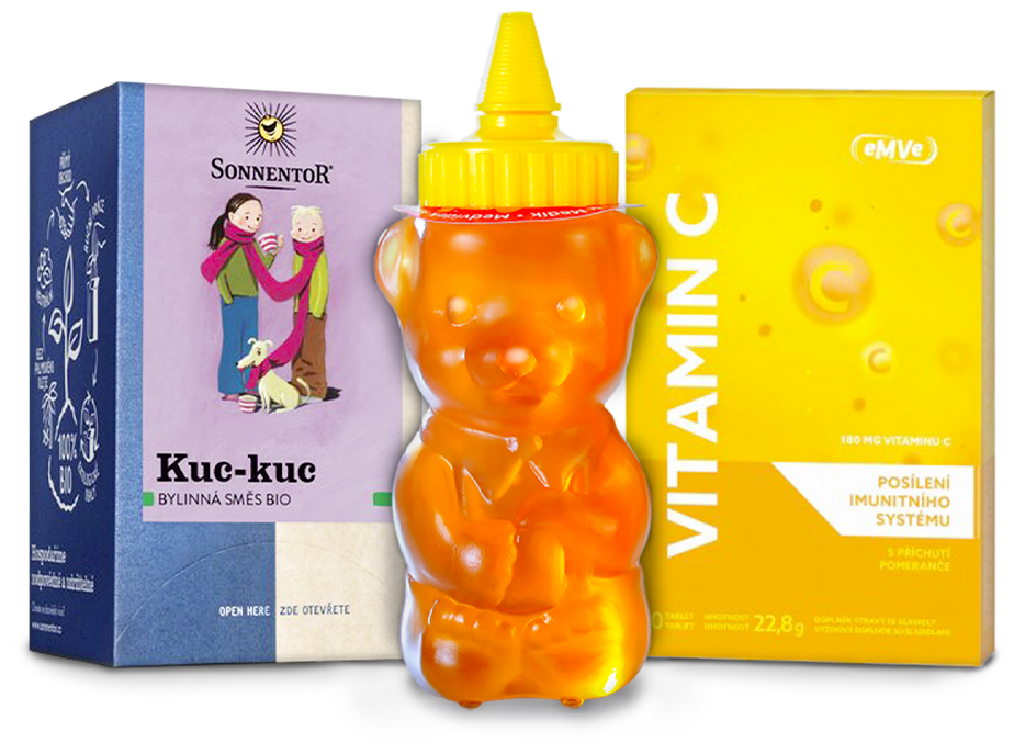 Medvídek med květový 250g, Vitamin C - 30 rozpustných tablet, Bylinný čaj proti nachlazení Kuc-Kuc 18 sáčků