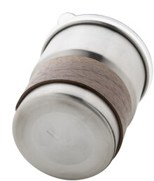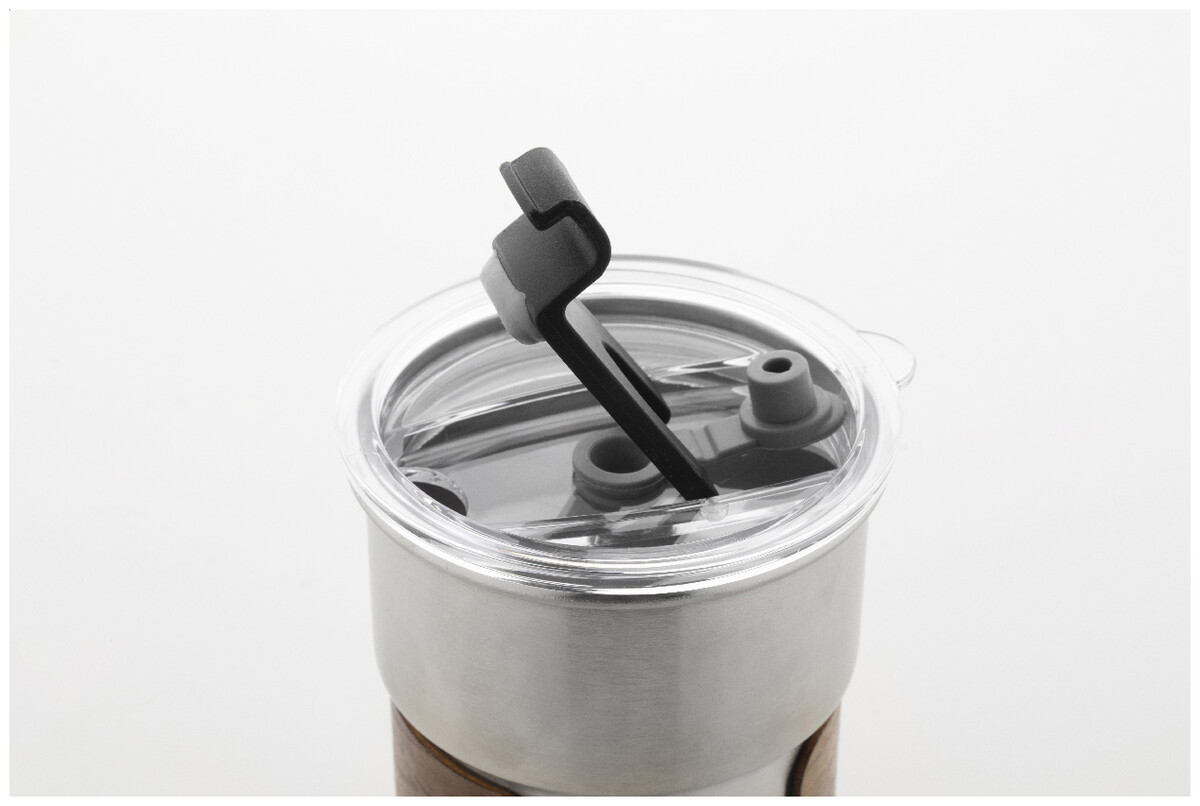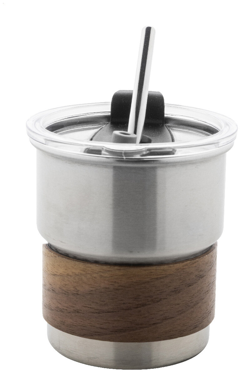 Jednostěnný cestovní hrnek z recyklované nerezové oceli s úchopem z ořechového dřeva, plastovým víčkem a brčkem z recyklované nerezové oceli. 260 ml.