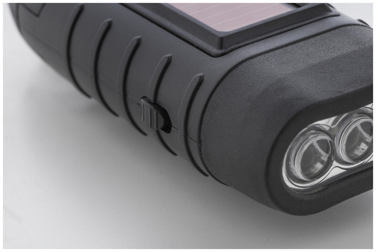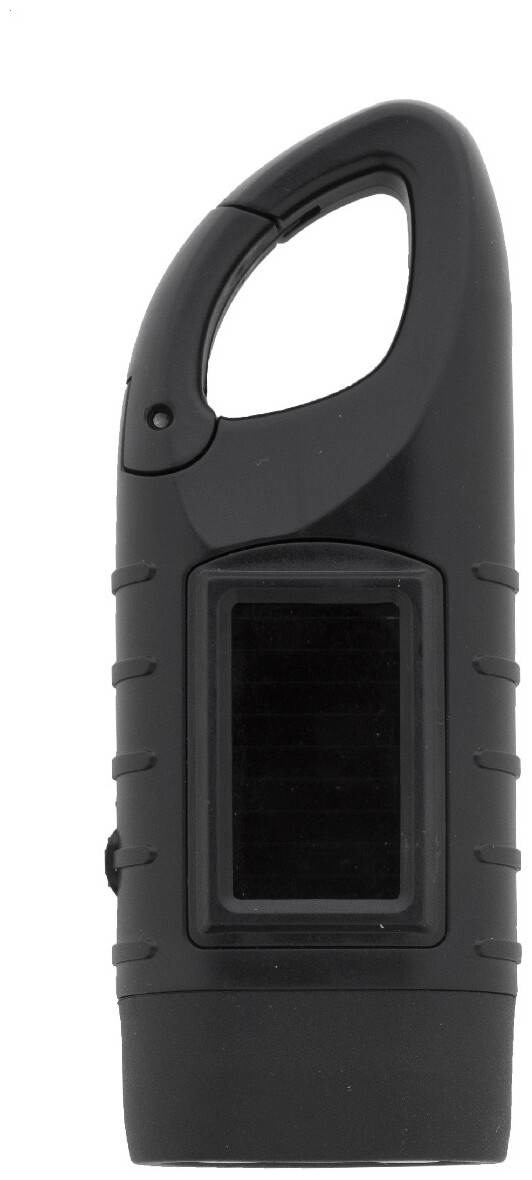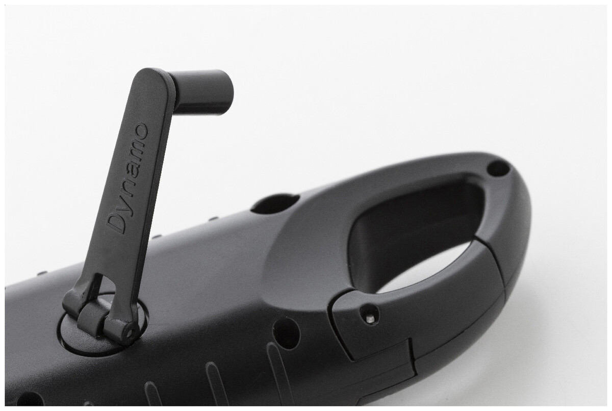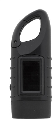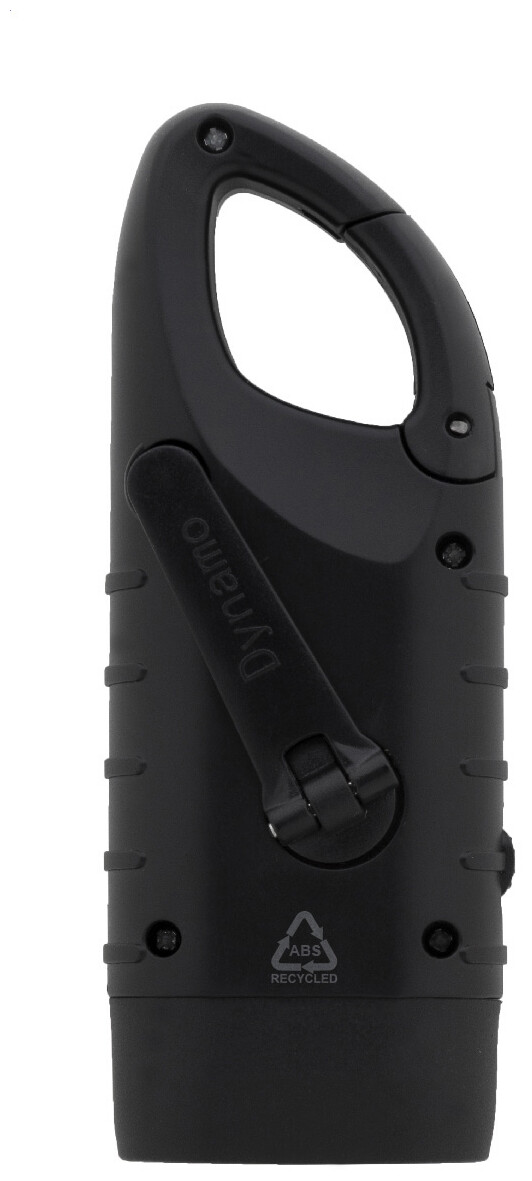 Baterka z recyklovaného ABS plastu se 3 LED diodami, vestavěnými solárními a dynamovými nabíječkami a karabinou.