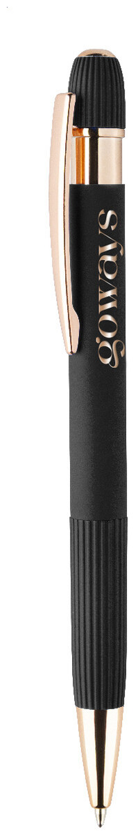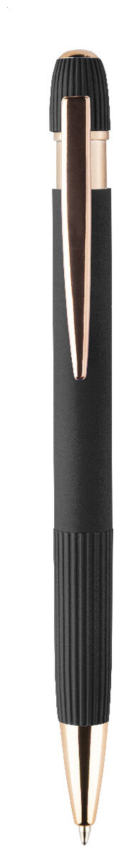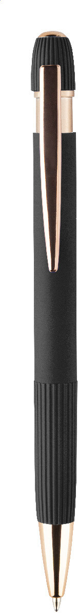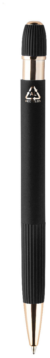 Kuličkové pero z recyklovaného hliníku s pogumovaným tělem a detaily v růžovo-zlaté barvě. Se speciálním povlakem pro zrcadlové laserové gravírování v růžovo-zlaté barvě. S modrou náplní.