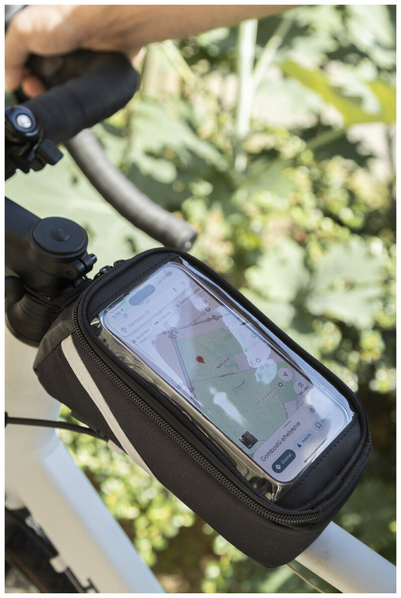Brašna na rám kola z RPET s přihrádkou na zip, kapsou na mobil s dotykovou obrazovkou, nastavitelnými popruhy na suchý zip a reflexními proužky. Polyester 600D RPET s výrazným štítkem RPET.