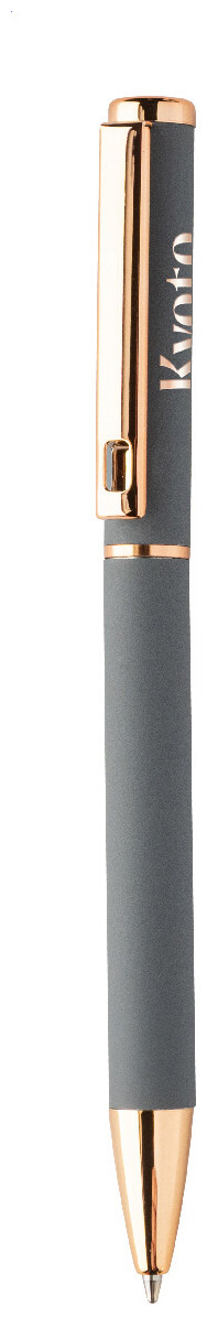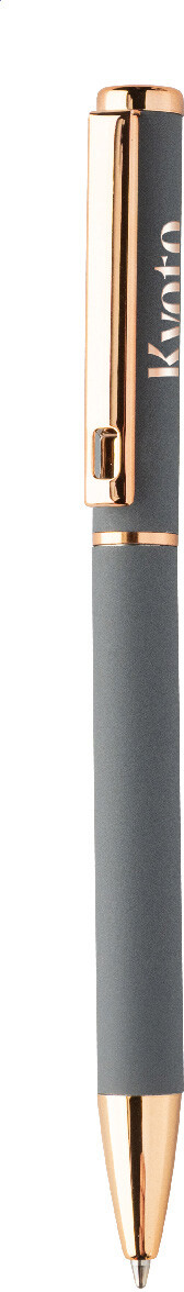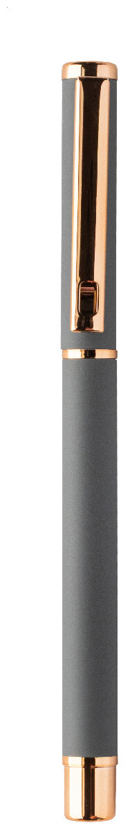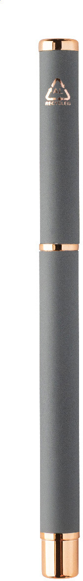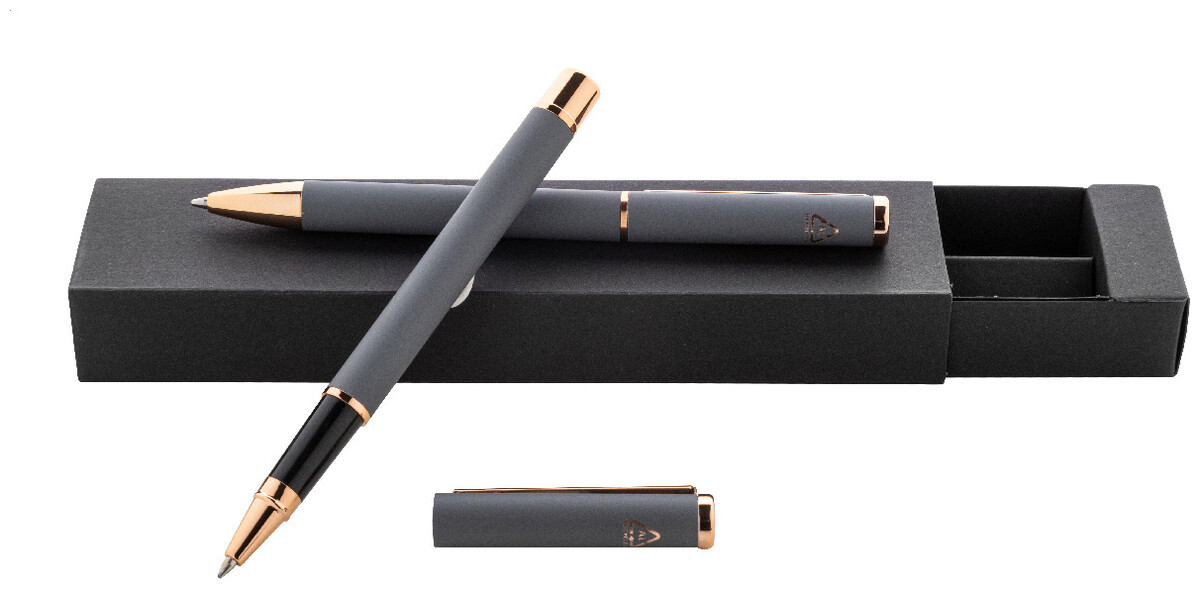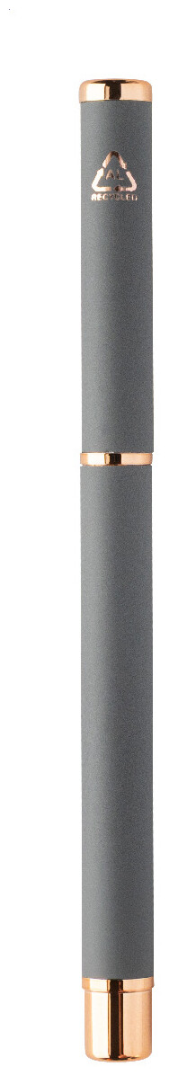 Sada per z recyklovaného hliníku s kuličkovým perem a rollerem s pogumovaným povrchem a detaily růžového zlata. S modrou náplní. Se speciálním povrchem pro zrcadlové laserové gravírování v růžovo-zlaté barvě. V černé papírové dárkové krabičce.