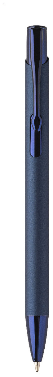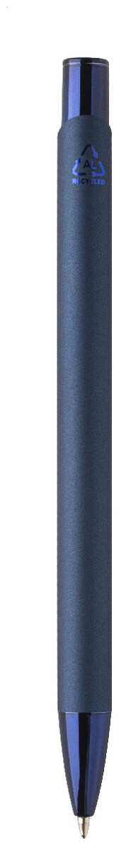 Kuličkové pero z recyklovaného hliníku s pogumovaným tělem a barevnými lesklými kovovými díly. Se speciálním povrchem pro zrcadlové gravírování, které odpovídá kovovým částem. S modrou náplní.