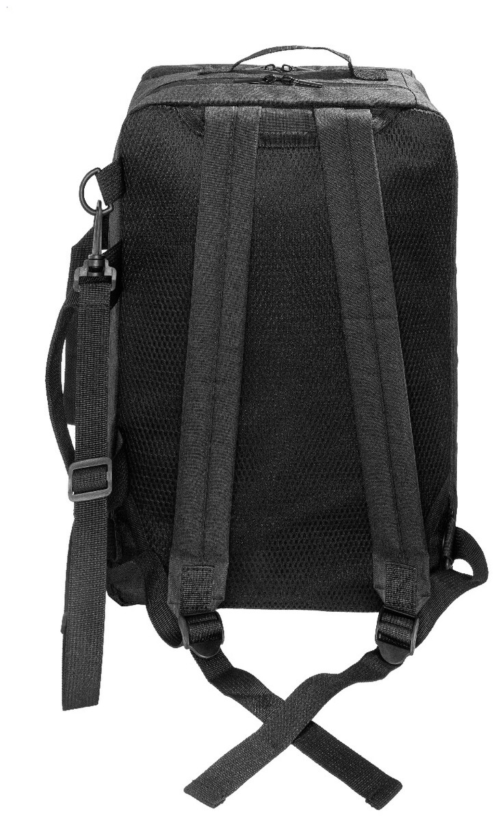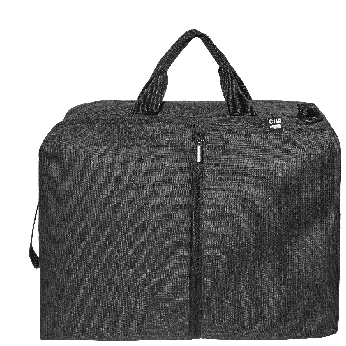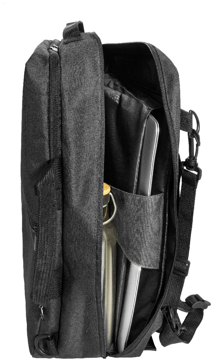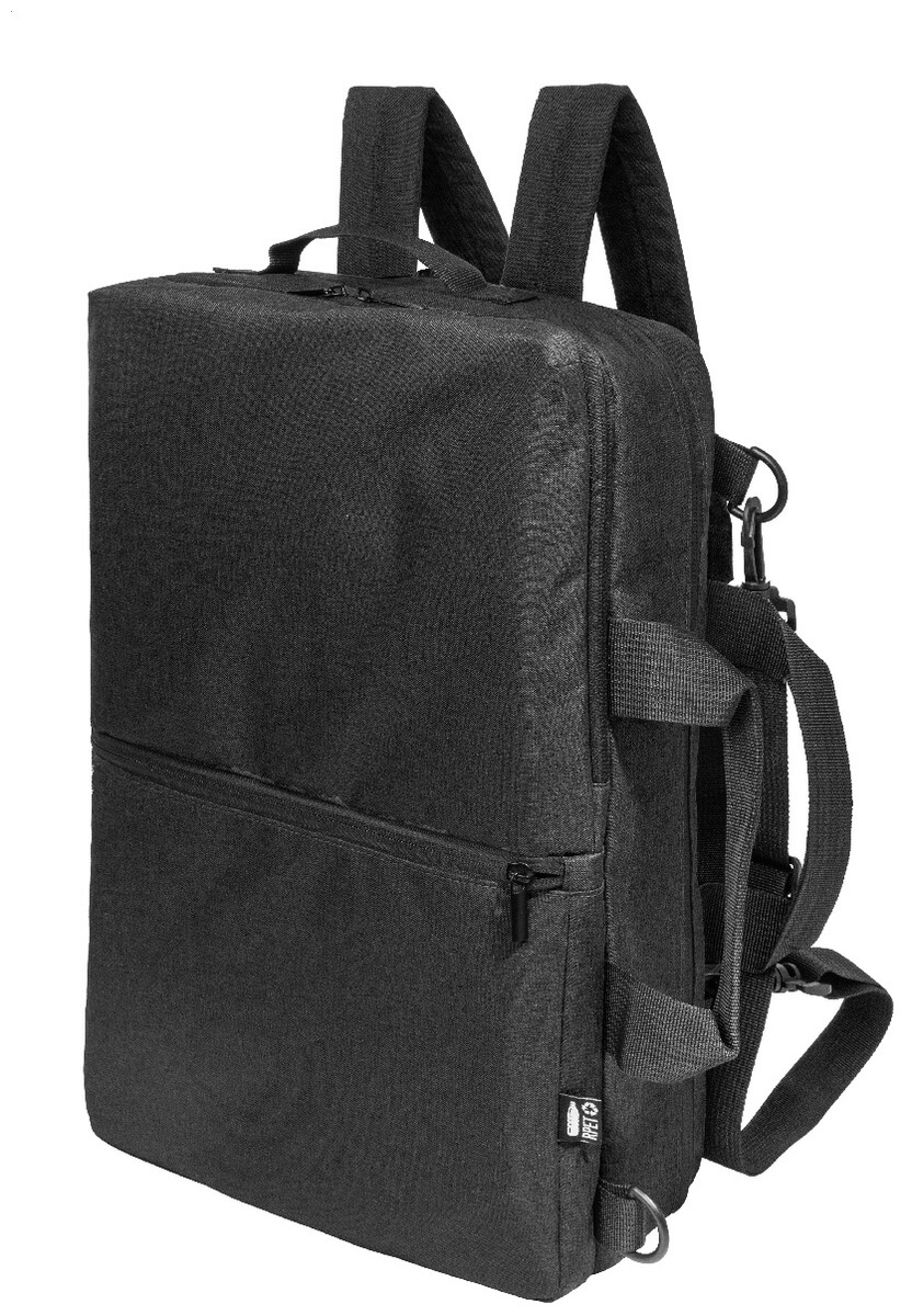 Dvojfunkční RPET batoh a taška na dokumenty s přihrádkou na zip, 2 předními kapsami na zip a polstrovanou přihrádkou na notebook (15"). S polstrovanými zády a ramenními popruhy. Součástí je i odnímatelný ramenní popruh pro použití jako taška na dokumenty. 600D RPET polyester s výrazným štítkem RPET.