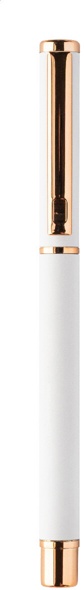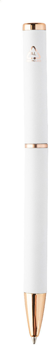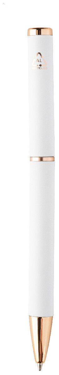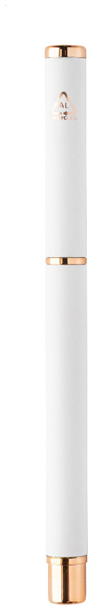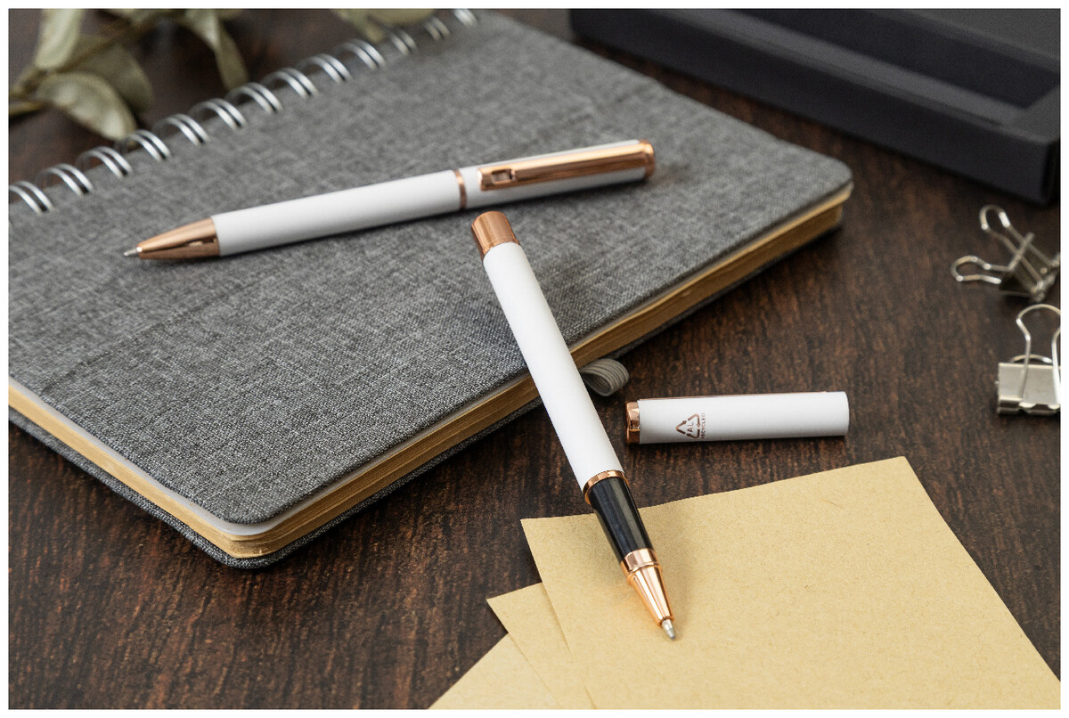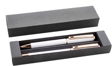 Sada per z recyklovaného hliníku s kuličkovým perem a rollerem s pogumovaným povrchem a detaily růžového zlata. S modrou náplní. Se speciálním povrchem pro zrcadlové laserové gravírování v růžovo-zlaté barvě. V černé papírové dárkové krabičce.