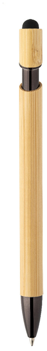 Bambusové dotykové kuličkové pero s lesklými kovovými detaily a barevným dotykovým stylusem. S modrou náplní.