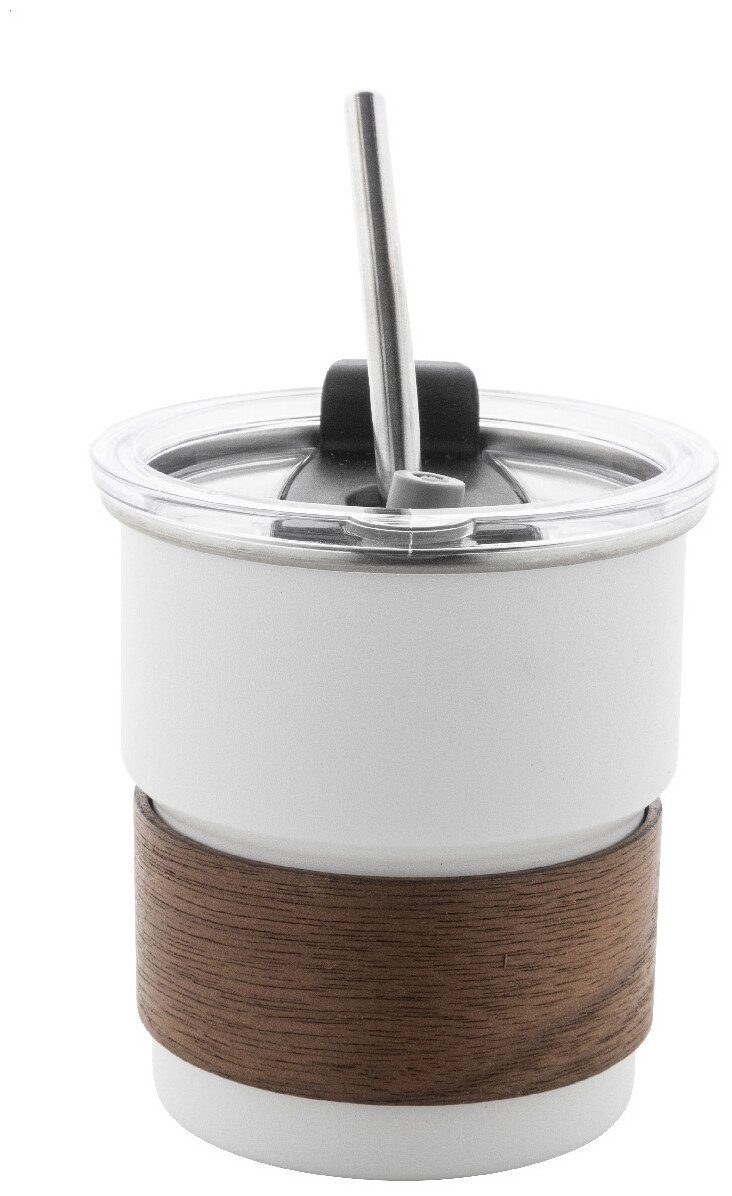 Jednostěnný cestovní hrnek z recyklované nerezové oceli s úchopem z ořechového dřeva, plastovým víčkem a brčkem z recyklované nerezové oceli. 260 ml.