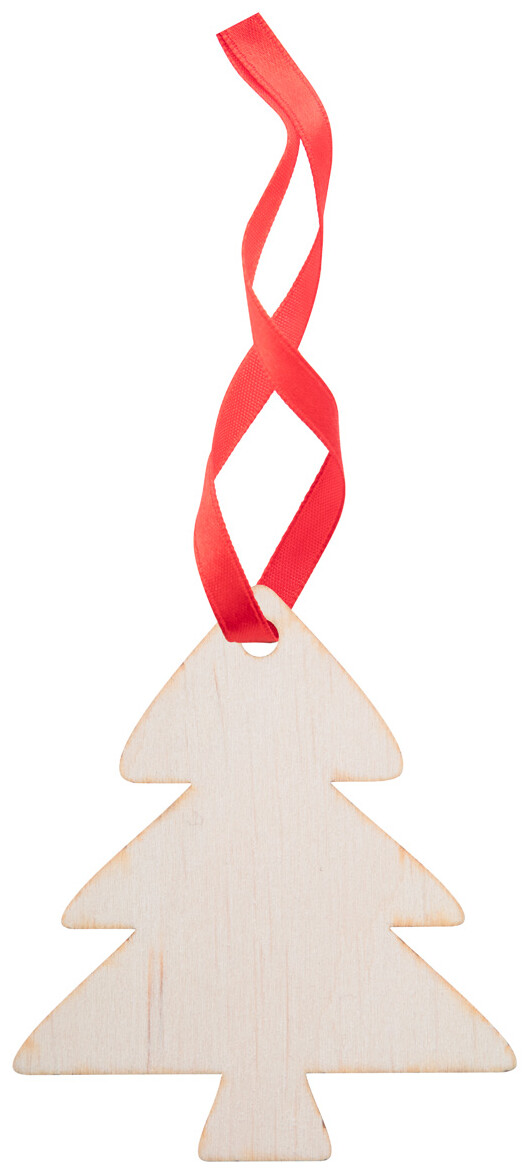 Vánoční ozdoba z březové překližky, dodáváno s oddělenou červenou stužkou.