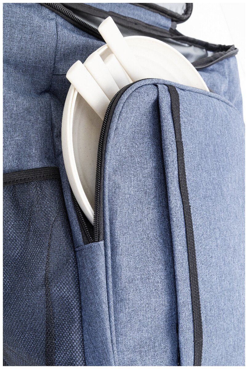 Chladicí piknikový batoh z RPET s přední kapsou na zip a chladicí přihrádkou na zip s PEVA výplní. S bočními síťovanými kapsami, polstrovanými zády a ramenními popruhy. Včetně nádobí z PP a nerezové oceli pro 2 osoby: 2 talíře, 2 hrnky, 2 vidličky, 2 lžíce a 2 nože. 600D RPET polyester s výrazným štítkem RPET.