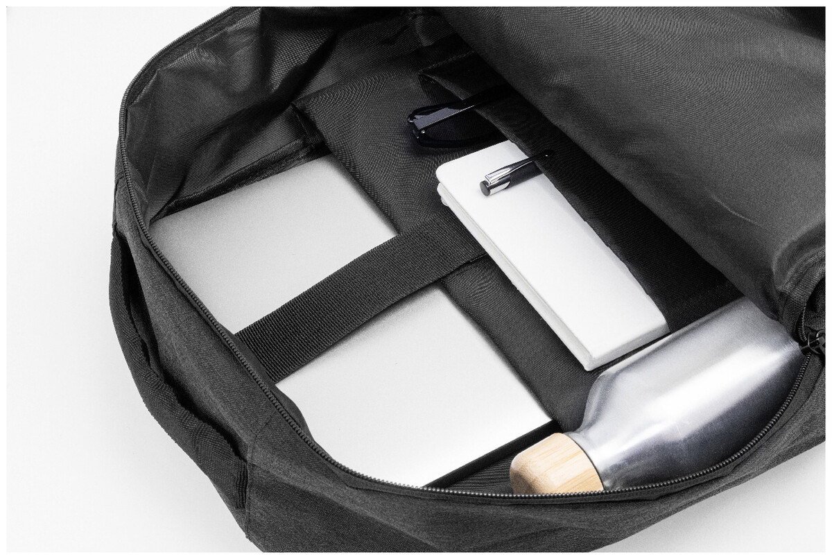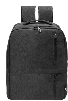 RPET batoh s hlavní přihrádkou na zip a 3 předními kapsami na zip. S polstrovanými přihrádkami na tablet (10") a notebook (15"), polstrovanými zády a ramenními popruhy. 600D RPET polyester s výrazným štítkem RPET.
