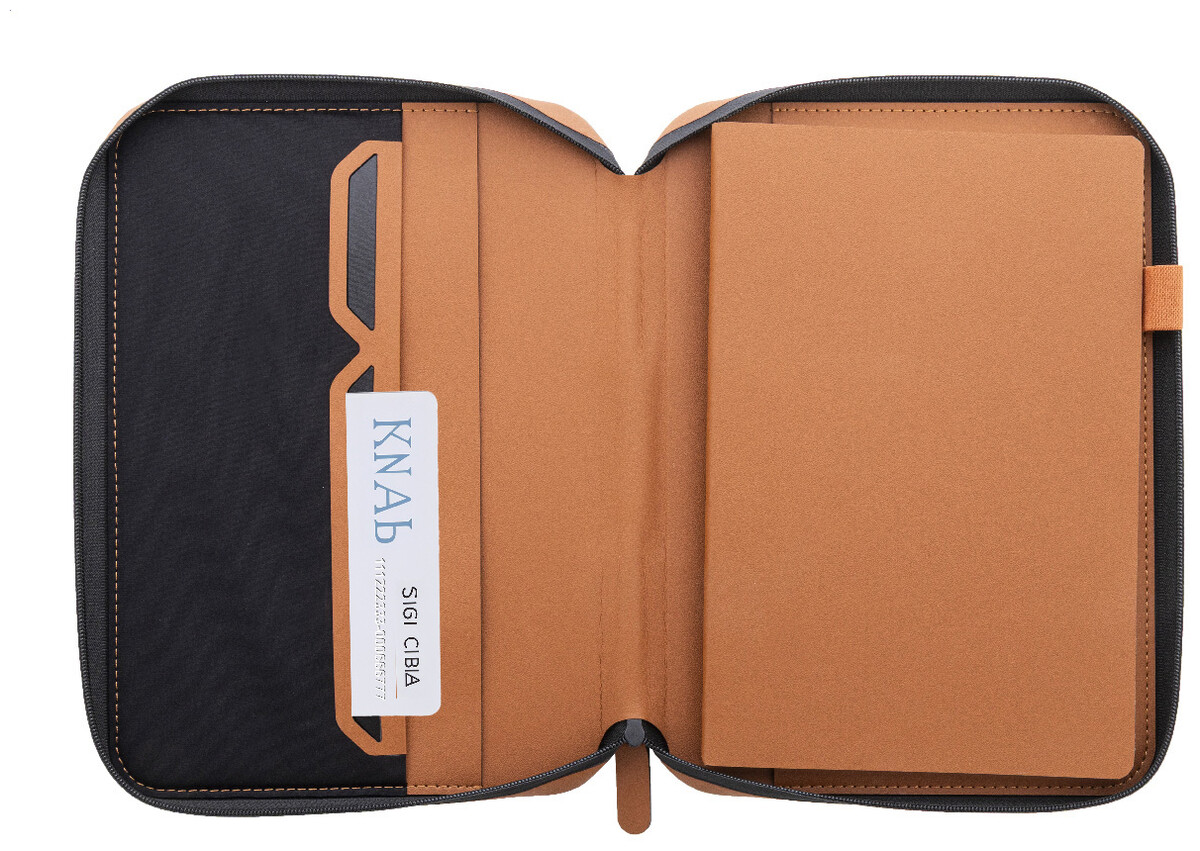 Luxusní složka na dokumenty A5 na zip z recyklované umělé kůže s 64 linkovanými listy a blokem z recyklovaného papíru. S několika vnitřními kapsami na karty a dokumenty.