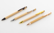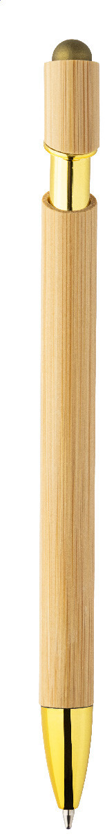 Bambusové dotykové kuličkové pero s lesklými kovovými detaily a barevným dotykovým stylusem. S modrou náplní.