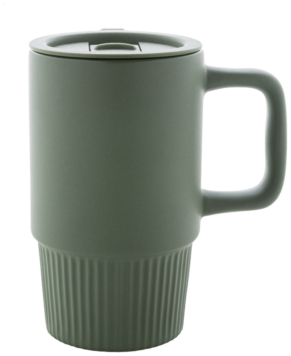 Vysoce kvalitní keramický cestovní hrnek s matným vnějším povrchem a plastovým víčkem z polypropylenu. 420 ml.