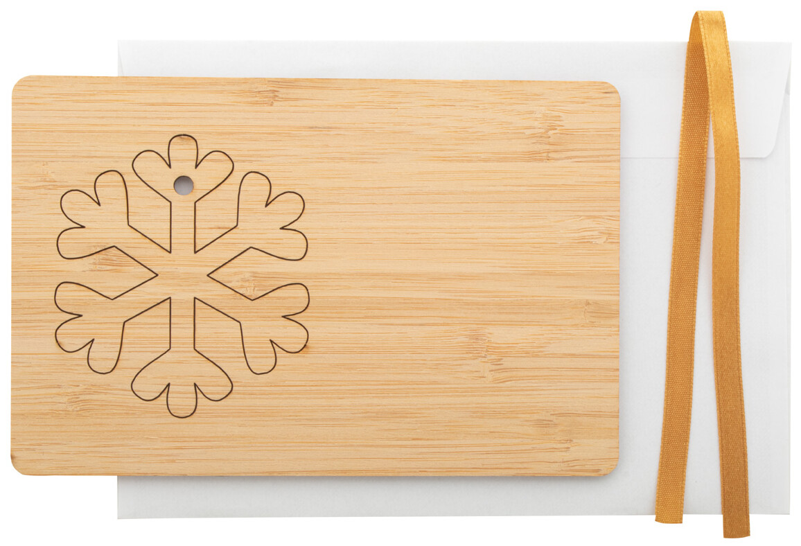 Vánoční přání v bambusové překližce s vylamovací ozdobou na vánoční stromeček se zlatou stuhou. Včetně poštovní obálky C6. Dodáváno s oddělenou stuhou.