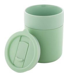 Silikonem potažený keramický cestovní kelímek s PP plastovým odkapávacím víčkem. 300 ml.