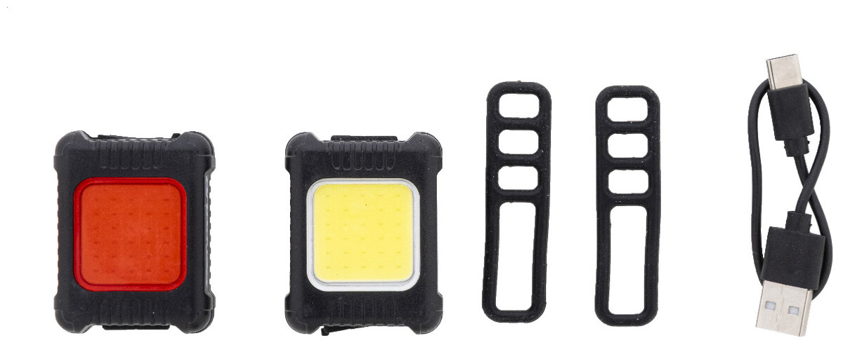 Sada 2 dobíjecích COB světel na kolo s plastovým pouzdrem, vestavěnou dobíjecí baterií přes USB (100 mAh) a elastickými montážními popruhy. Se 3 režimy svícení. Včetně nabíjecího kabelu přes USB. Neprodejné v následujících zemích: Německo, Rakousko, Švýcarsko.