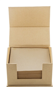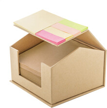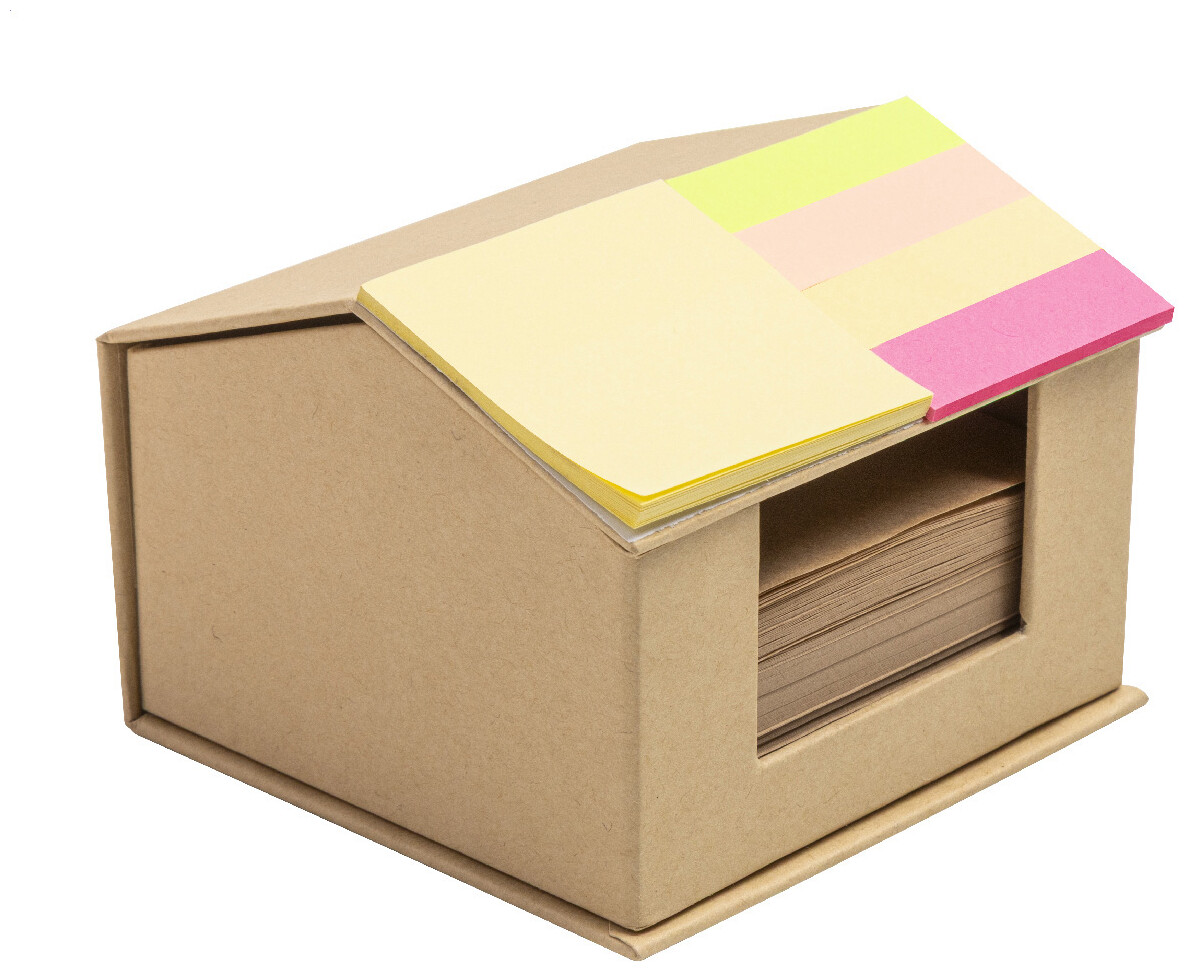 Dávkovač poznámkových bloků ve tvaru domečku z recyklovaného kartonu s blokem na 300 listů z recyklovaného kraftového papíru. Včetně 25 žlutých samolepicích papírků a 100 značkovačů stránek (ve 4 barvách) nahoře.