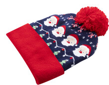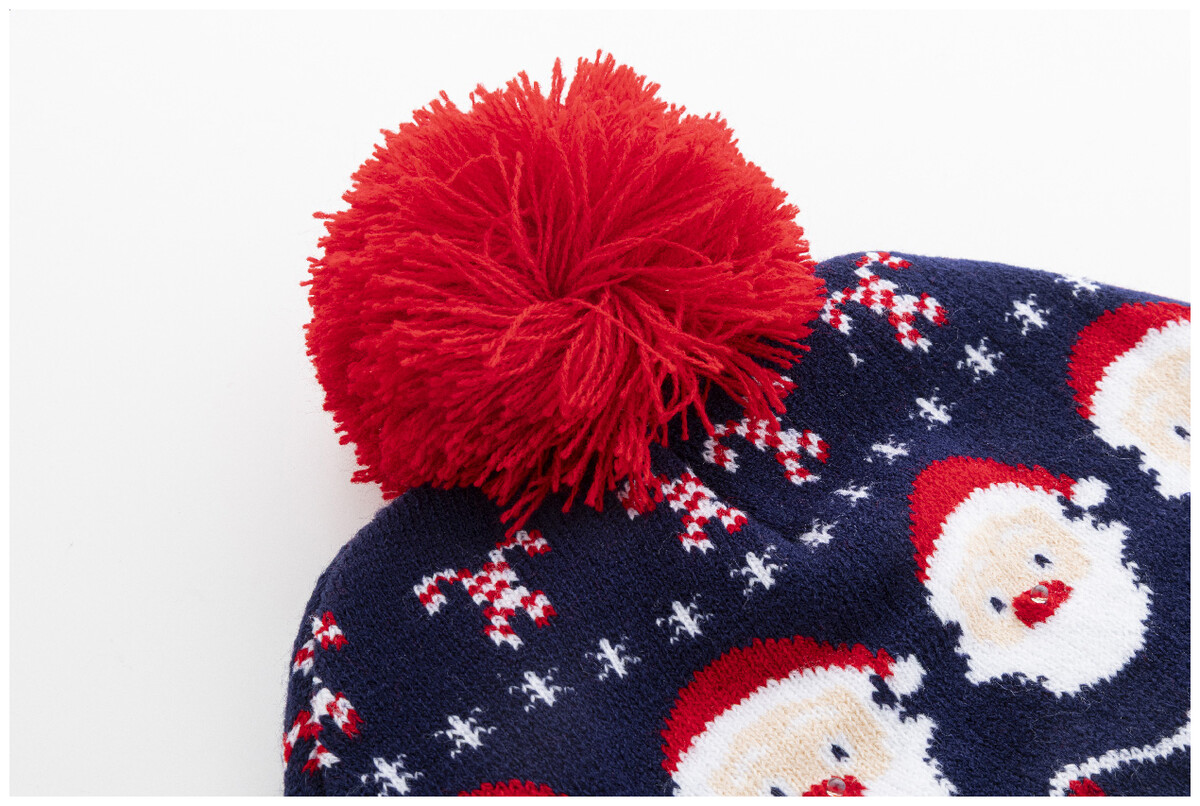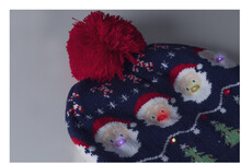 Pletená vánoční čepice z akrylu se 6 LED světly (3 režimy svícení), manžetou a bambulí. S knoflíkovou baterii.