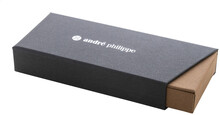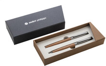 Elegantní sada kovového kuličkového pera a rolleru s dřevěným tělem a lesklými detaily v barvě antracit. Ve dvoubarevné dárkové krabičce s modrou náplní. Produkt značky André Philippe.