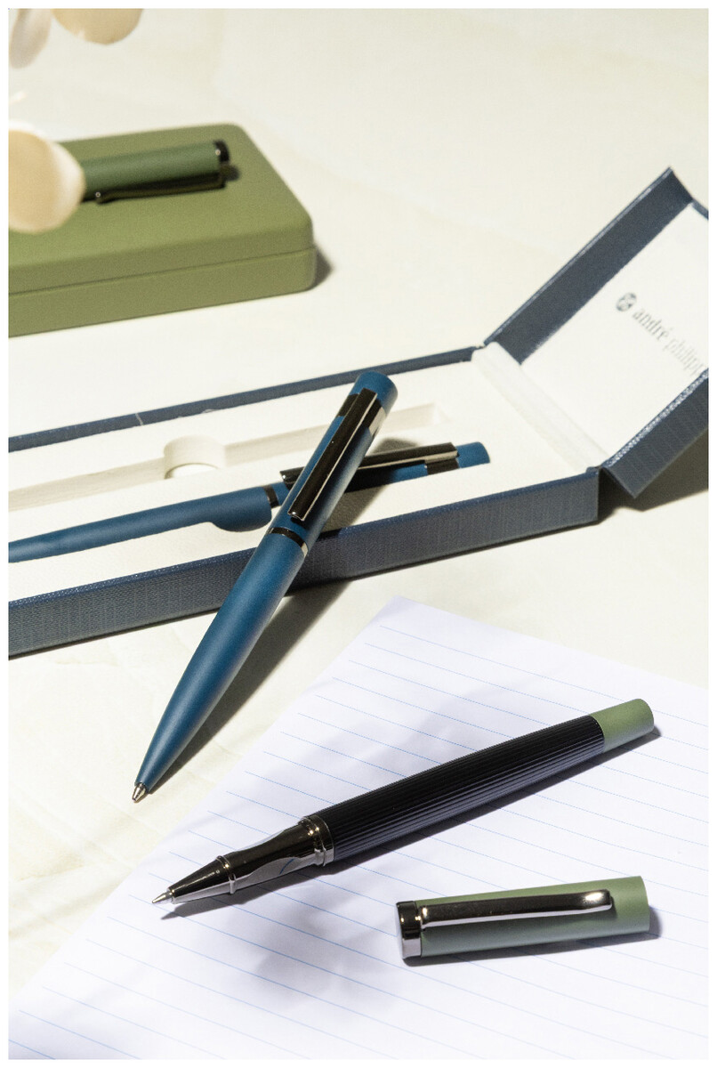 Elegantní sada kovového kuličkového pera a rolleru s pruhovaným tělem, barevnými akcenty a lesklými detaily v barvě antracit. V barevně sladěné dárkové krabičce a s modrou náplní. Produkt značky André Philippe.