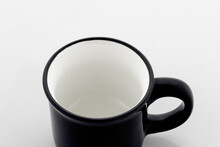 Mini vintage keramický hrnek s černým okrajem, bílým uvnitř a barevným vnějškem, 90 ml. V krabičce z kraftového papíru.
