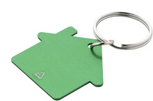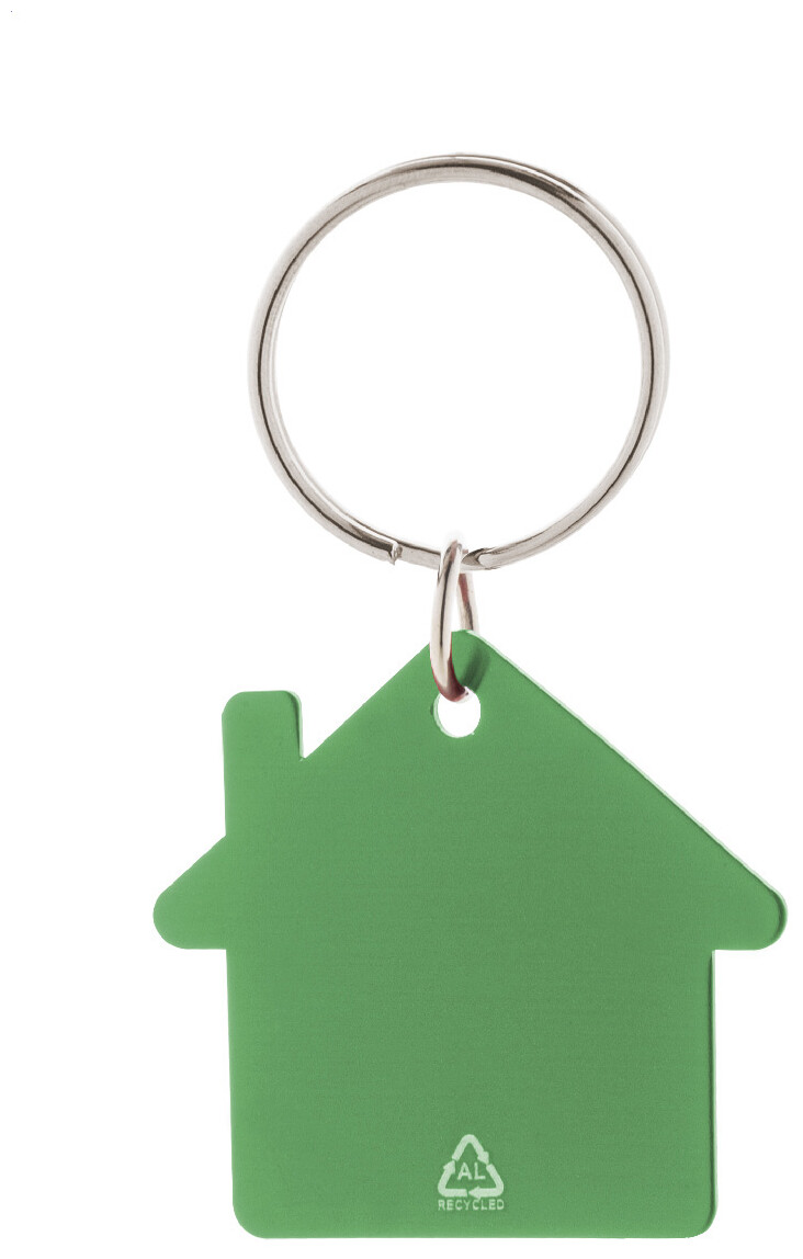 Přívěšek na klíče ve tvaru domečku z recyklovaného hliníku s kovovým kroužkem.