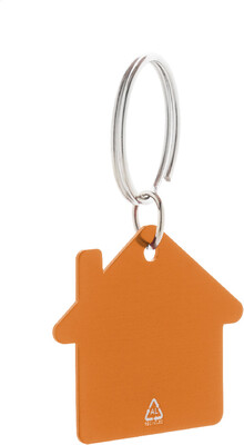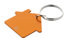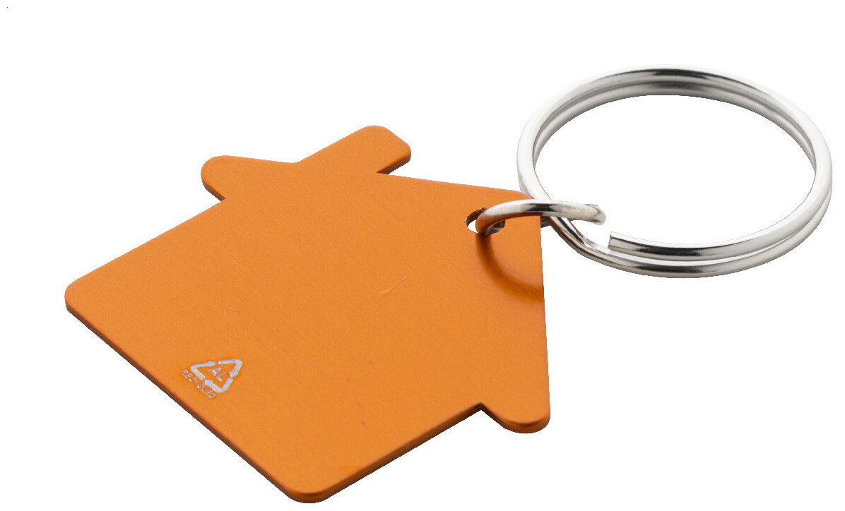 Přívěšek na klíče ve tvaru domečku z recyklovaného hliníku s kovovým kroužkem.