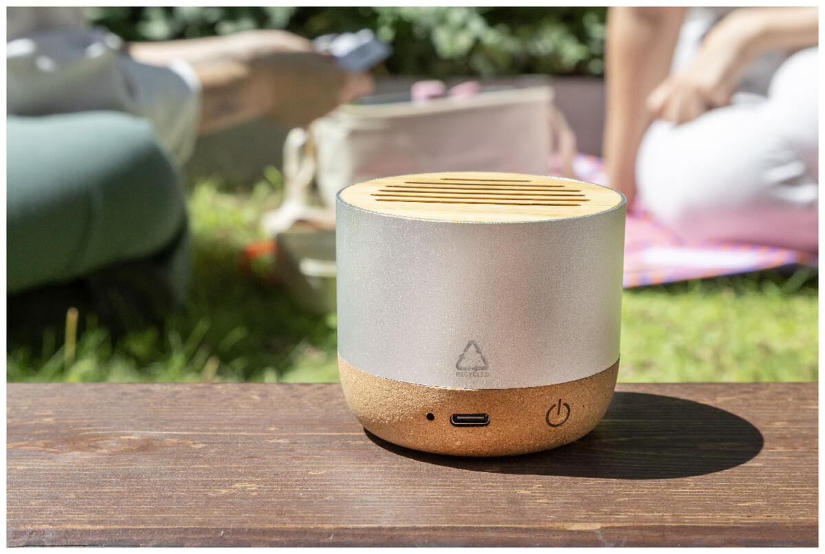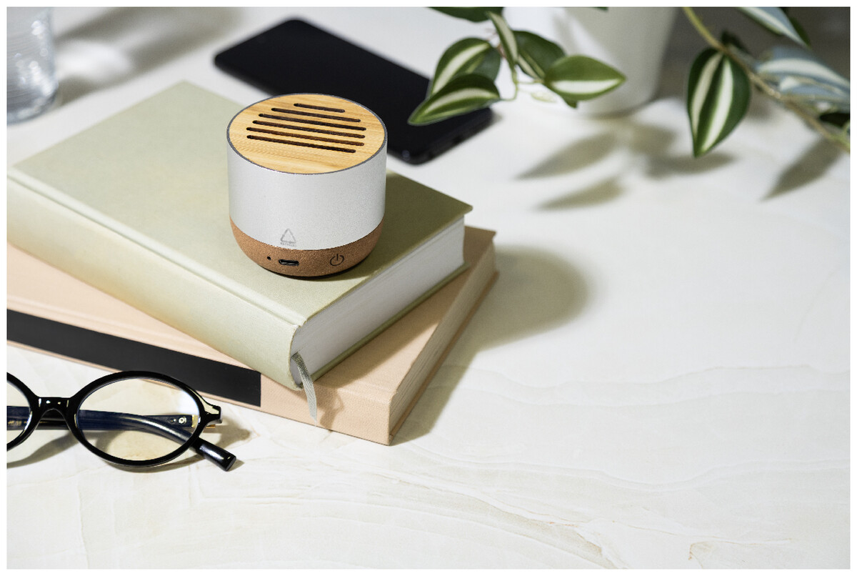 Bezdrátový reproduktor v pouzdře z recyklovaného hliníku s bambusovou síťovinou a základnou z přírodního korku. S dobíjecí baterií (400 mAh). Včetně nabíjecího kabelu USB.
