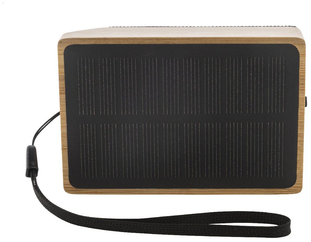 Bezdrátový reproduktor z bambusu s polyesterovou síťovinou RPET, vestavěnou solární nabíječkou, popruhem na nošení a dobíjecí baterií (300 mAh). Včetně nabíjecího kabelu USB.