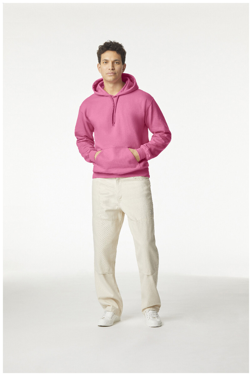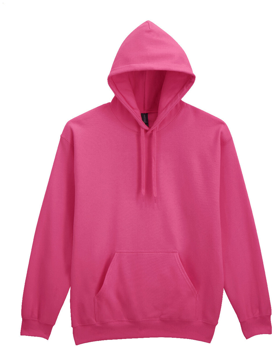 Mikina s kapucí, 80% bavlna a 20% polyester s přední kapsou. 285 g/m2 (bílá 278 g/m2). Značka Gildan.